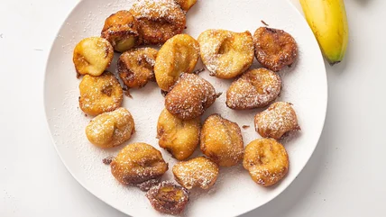 To make deep-fried bananas, you'll need just eight ingredients (not including toppings): bananas, all-purpose flour, granulated sugar, baking powder, salt, vegetable oil, milk, and an egg. For this recipe, we recommend sticking with firmer bananas, ones that are only slightly ripe, as this will help keep the deep-fried pieces from becoming mushy or falling apart. Once you've chosen your bananas, follow our recipe by prepping the bananas, making the batter, and deep-frying. Be sure to take special care when deep-frying, as hot oil can bubble and splatter out of the pot, especially when adding the battered bananas to the oil.