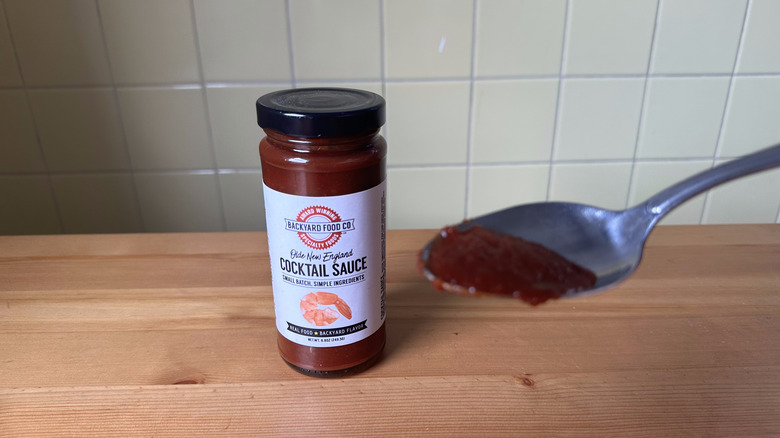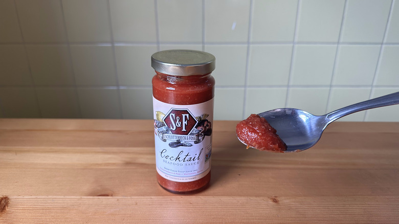 A lot of times, savory sauces that have a lot of sweetness to them can overpower the food they're flavoring, but that's not the case here. The S&F cocktail sauce is definitely one of the sweetest-tasting varieties in this lineup, but it seriously works, making it the second-best sauce in our ranking. That's because there's just so much flavor going on. That sweetness is tempered by a strong acidity that will make your nose wrinkle (in the best possible way). There's also plenty of horseradish here — it definitely delivers on the spiciness front. In fact, just looking at this sauce, you can see how much more horseradish-y it is than other varieties. Horseradish is listed first on the sauce's ingredient label.