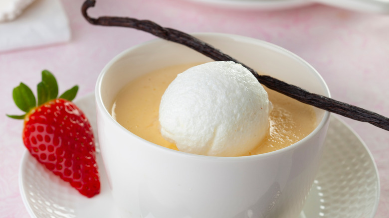 Île flottante is a classic French dessert that presents baked meringue in a dish filled with crème anglaise. The plating offers an impressive visual quality, and while the recipe can take some time to put together, the list of ingredients isn't intricate or complicated. Chefs must steel themselves to make meringue, a somewhat time-consuming process to get the mixture perfect. When combined at lower speeds, egg whites and sugar can take up to 10 minutes until solid peaks form. While you can try to quickly whip the ingredients into submission in an attempt to reduce your overall prep time, quickly-made meringue is at risk of being less stable than slowly-made varieties. For a more reliable result, cooks-in-the-know — like Child — gradually add sugar and let the granules fully dissolve throughout the whipping process.