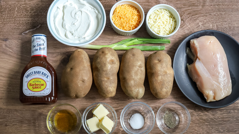 Gather the ingredients for these barbecue chicken-stuffed twice-baked potatoes