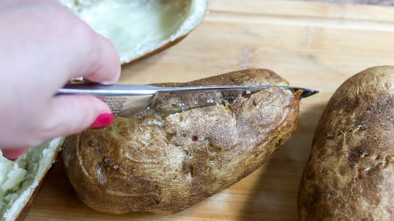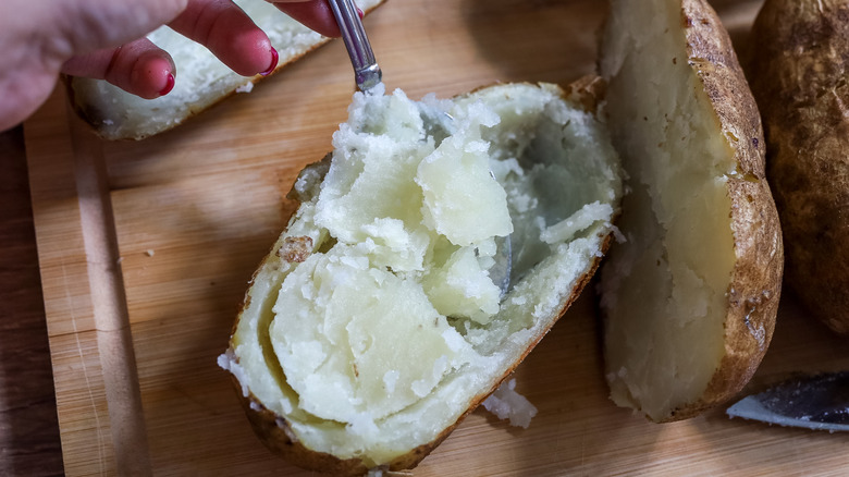 The first tip for perfect twice-baked potatoes is to choose the right type of potato. For this recipe, you want large baking potatoes, so Russets work well here. Russets are starchy and have thick skins that hold up well for double baking. If you cant find Russet potatoes, you can use Idaho potatoes. Wash the potatoes before you start this recipe, and make sure that they are completely dry before piercing them with a fork. If your potatoes aren't totally dry, the moisture on them can keep the skins from getting nice and crispy. This is also why these potatoes are cooked on a baking sheet rather than in foil, because foil can make your baked potatoes mushy.