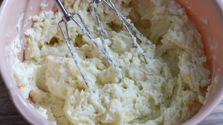 - Add the sour cream, melted butter, salt, pepper, half of the cheddar, and half of the Monterey jack to the bowl with the potatoes. Mix with a hand mixer until combined and creamy.