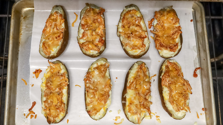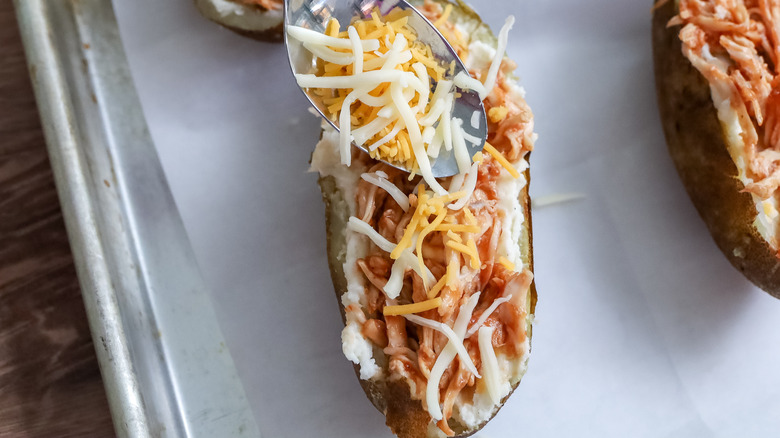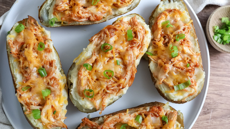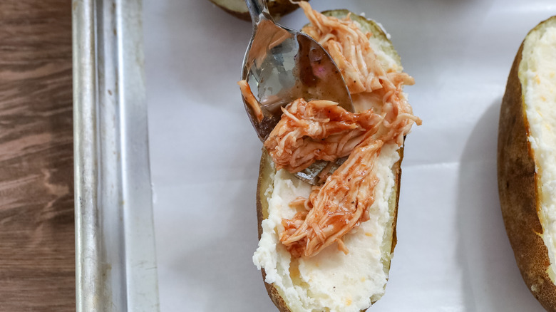 Twice-baked potatoes are a classic, and for good reason. With their crispy skin and creamy filling, they are the perfect dish for almost any occasion. While the classic version is fine the way it is, there are so many ways that you can jazz them up with fun fillings. Recipe developer Jessica Morone brings us this exciting twist on the classic, which combines the smoky, savory goodness of barbecue chicken with the creamy richness of twice-baked potatoes. She came up with this variation after she visited a local barbecue restaurant that had baked potatoes with pulled chicken in them. She thought, "this would be even better if the potatoes were twice-baked and topped with tons of cheese."