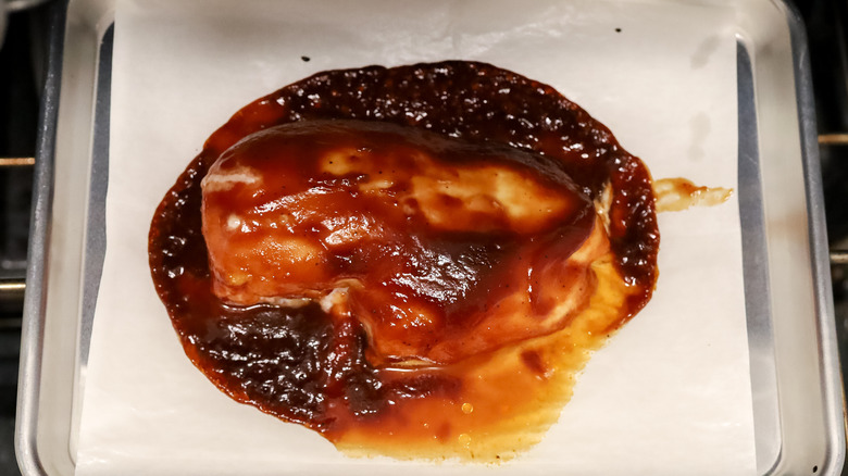 - Place the chicken on the other baking sheet and brush with ¼ cup of the barbecue sauce.