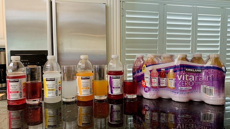 Kirkland Signature Vita Rain Zero is Costco's answer to vitaminwater's Zero Sugar line of beverages. Infused with vitamins, Vita Rain Zero comes in an array of flavors: dragon fruit, mango, acai blueberry pomegranate, and lemonade. While vitaminwater's drinks are sweetened with monk fruit and stevia, Vita Rain Zero uses sucralose.