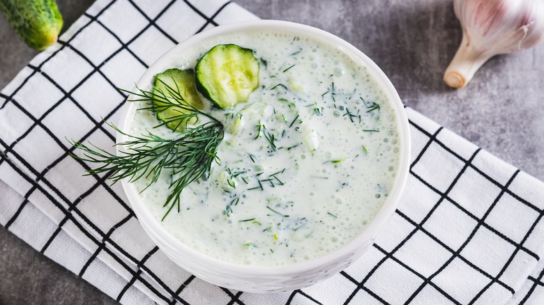 Tzatziki is a Mediterranean dip that brings together yogurt, cucumber, garlic, herbs, and lemon juice or vinegar. In Greek cuisine, it's often served as an appetizer with pita bread, and the classic gyros wouldn't be the same without it. It's the balance of creamy, tangy, herby elements that make tzatziki just as versatile as a sandwich, and pairing the two is a match made in heaven that provides endless opportunities for customized flavors. Swaps like using cilantro or basil in place of the traditional dill will create a different flavor profile, while adding some extras like toasted sesame seeds give the dip more dimension.