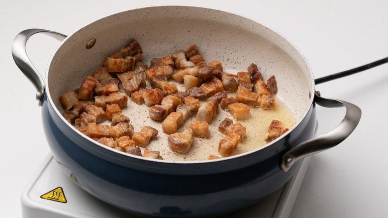 This technique is highlighted in Tasting Table's twice-cooked pork belly stir-fry created by recipe developer Jennine Rye. Pork belly comes from the under section of the pig, so it's fatty and often comes attached to skin. By cooking it twice you'll ensure all parts, from skin to fat, achieve the right texture and flavor before the meat goes into the pot or wok with the rest of the ingredients. To achieve that crispy exterior met with a softness inside, the two-step method includes boiling first then frying.