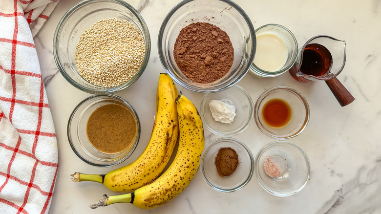 Add the quinoa to a food processor with the cacao powder, maple syrup, almond butter, bananas, soy milk, baking powder, cinnamon, and vanilla extract.