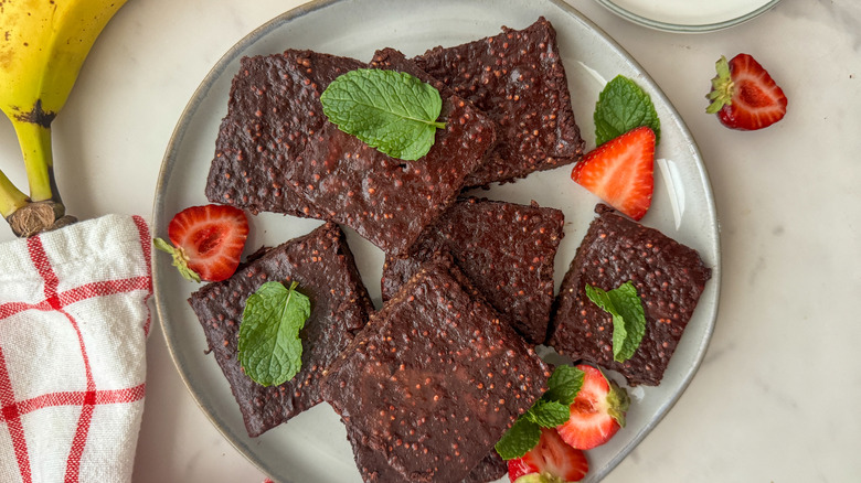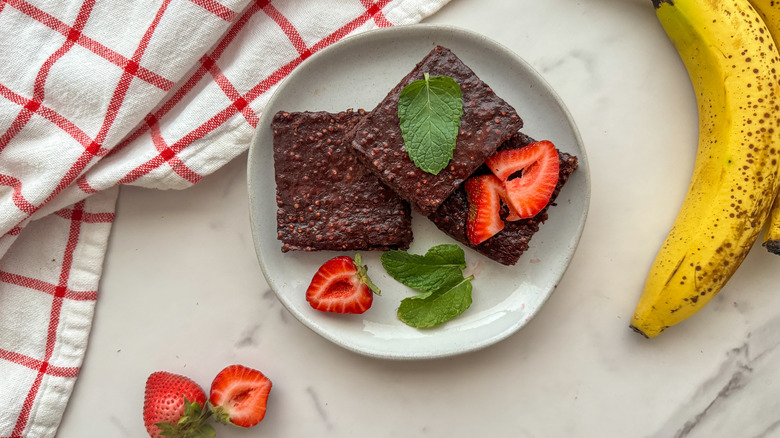 You'll need two ripe bananas, so make sure to allow time for them to ripen on your counter before making these brownies. Then, check your pantry for baking powder, cinnamon, vanilla extract, and salt. For a pretty presentation, you may want some strawberries and fresh mint.
