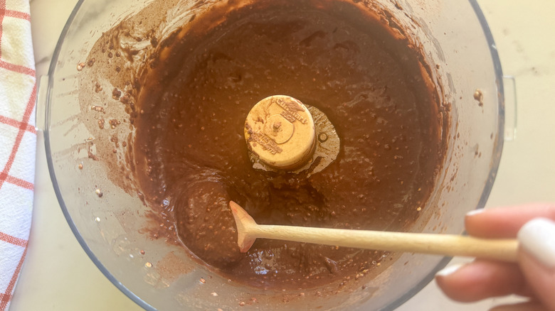 - Add the quinoa to a food processor with the cacao powder, maple syrup, almond butter, bananas, soy milk, baking powder, cinnamon, and vanilla extract.
