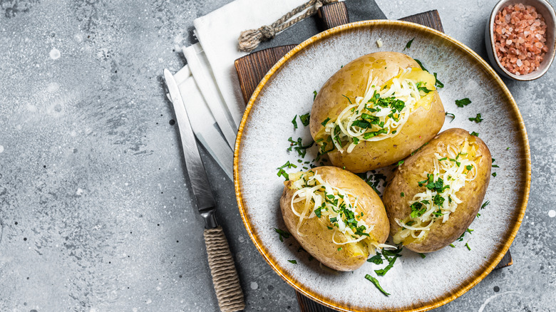 Preheating your air fryer will also ensure that the baked potatoes are cooked faster. If you're someone who likes to give the vegetables ample time to soften and cook but still want crispy skin, you can preheat the air fryer and then reduce the temperature once the exterior has browned and wrinkled, just like you would with twice-baked potatoes. Heating it to 400 degrees Fahrenheit is the sweet spot for getting that delicious skin that's sought after. Let the spuds cook for around 40 minutes, then lower the heat to 350 degrees Fahrenheit to allow them to cook for a while longer.