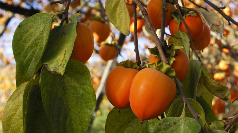 Once you've scoured the grocery store to find the right persimmons, you can use them in all different types of foods that include appetizers, entrees, snacks, and even desserts. The most distinct difference between fuyu and hachiya varieties is the level of astringency in either one. Whereas hachiya persimmons are known to be particularly astringent, fuyus are much more mild and sweet. Biting into a ripe fuyu persimmon will typically provide a firm texture with a honey-sweet taste. A ripe hachiya will be more squishy, with a texture that is similar to pudding.