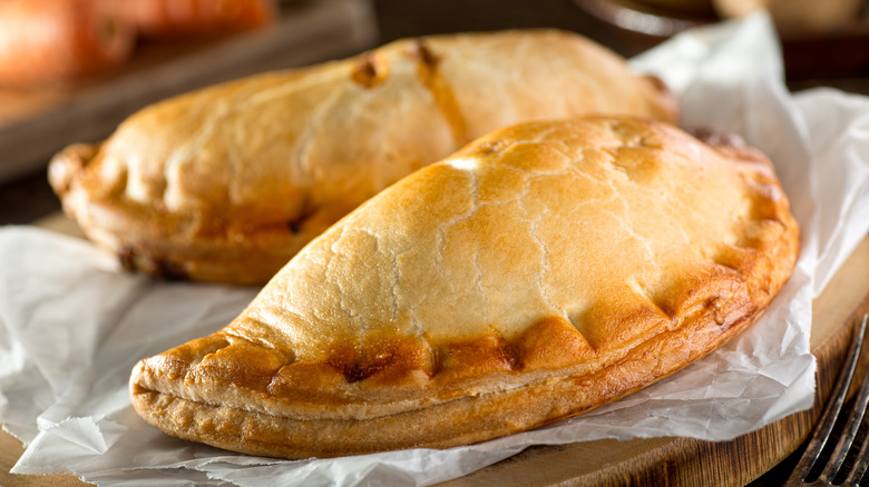 A pasty lands somewhere between a calzone and a savory turnover. For all intents and purposes, it's another form of meat pie, but one that's dressed in an extra thick crust so it can be picked up and eaten on the go. Ground beef or pork are often the included meats of choice, accompanied by hearty veggies like potatoes, onion, carrots, and rutabagas (a cross between cabbage and a turnip).