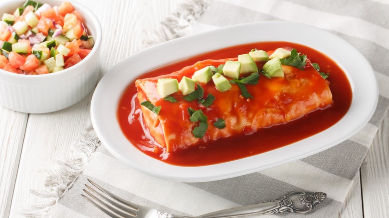The first ever wet burrito was introduced by the Beltline Bar in Grand Rapids, Michigan in 1966, and the restaurant still wears this achievement as a burrito-sized badge of honor. It touts this fact on its website and menus, and you can find close to a dozen wet burrito options on its bill of fare as of August 2024. The standard — known as Beltline's "The Famous" — is stuffed with all the usual suspects like ground beef, beans, lettuce, and tomatoes, then drowned in a burrito sauce and plenty of shredded Colby cheese on top. It might be the one and only burrito type that I would classify as fork-and-knife style fare rather than a handheld.