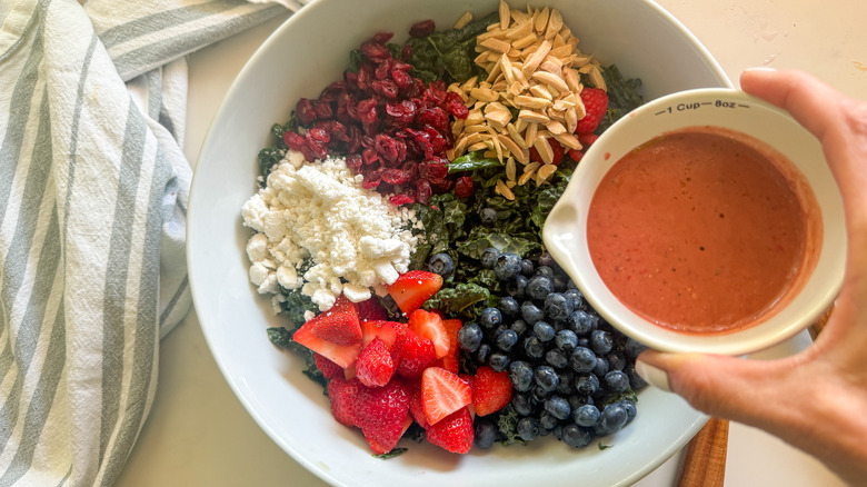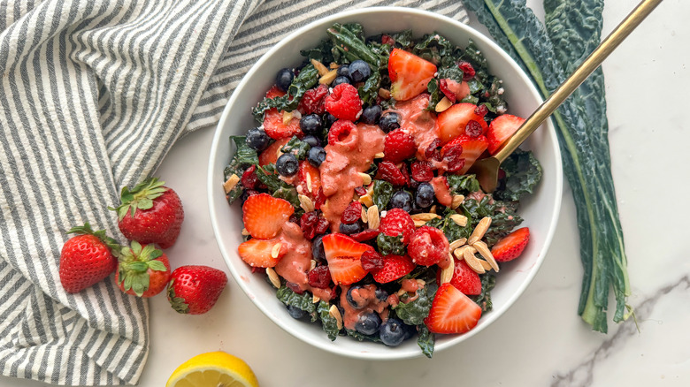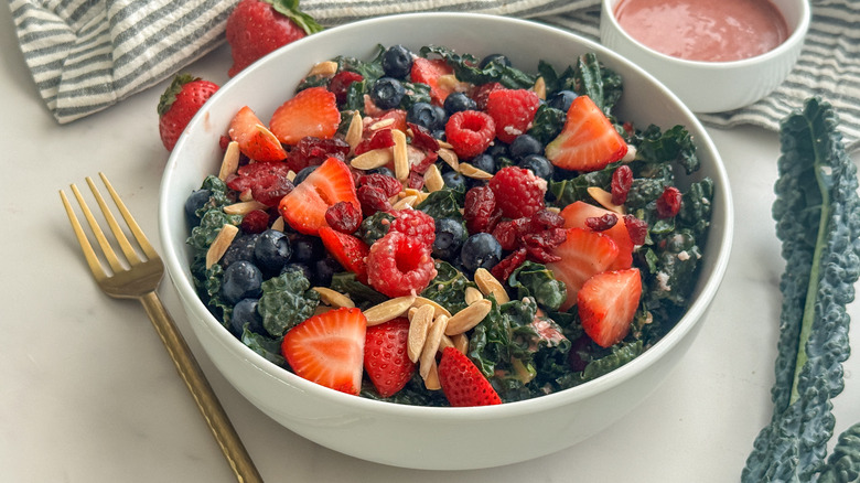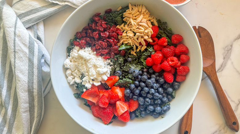 - Add the strawberries, blueberries, remaining raspberries, slivered almonds, dried cranberries, and feta cheese to the bowl with the kale.