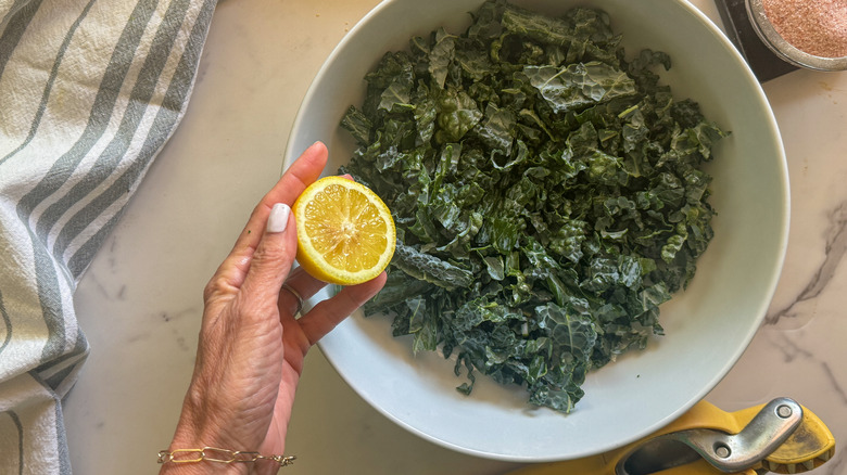 - Squeeze the lemon over the kale and season with ¼ teaspoon of salt.