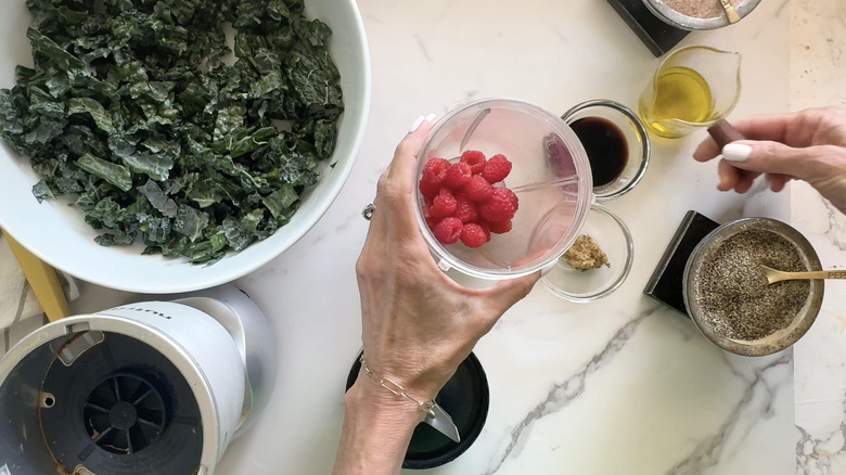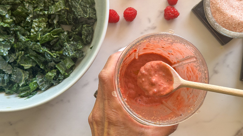 - To make the dressing, add ½ cup of raspberries to a blender along with the olive oil, balsamic vinegar, mustard, remaining salt, and pepper.