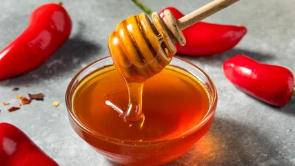You will want to use apple cider vinegar instead of white vinegar for hot honey. Derived from the fermentation of apple juice, apple cider vinegar's sourness is balanced by some of its own fruit sweetness and warmth, whereas white vinegar (from the fermentation of grain alcohol) could be too sharp and bright for honey. You can also use red wine vinegar, another ingredient that you can make right at home. When you're adding vinegar, use one or two teaspoons to taste. Figure out how sweet the honey is turning out to be and add as much or as little vinegar as you prefer.