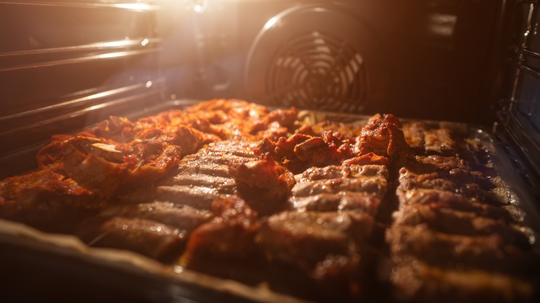 One of the big questions on your mind when oven-cooking ribs may be whether or not to wrap them in foil. There is certainly a good reason to do so — the foil helps the meat to retain moisture and absorb its own juices as it cooks. However, it also shields the ribs from the direct heat of the oven, preventing the beautiful browning of the meat. The trick, according to Ed Reavis, is to add the foil to the meat after the initial cooking has taken place.