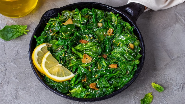 It really doesn't get any simpler than sauteing when it comes to cooking spinach. Just 10 minutes in the kitchen with a few pantry staples and you've got a scrumptious plate of veggies to dig into. It requires nothing more than salt, pepper, lemon juice, and a few drops of oil. Popular cooking oils like olive and vegetable oil are undoubtedly necessary, but those are not the only varieties that come in handy. When you want to take things up a notch without altering the whole flavor profile, sesame oil (which you can easily make at home with just two ingredients) is the subtle addition we recommend. Just a splash is enough to kickstart the flavor wonder.