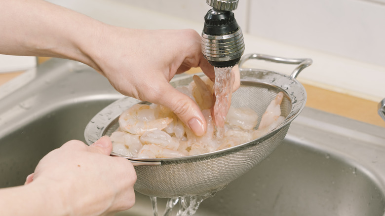 If you're looking to whip up shrimp scampi or garlic butter shrimp for tonight's dinner, know that cooking with the shellfish involves some cleaning and preparing for the freshest flavor. Even when you buy shelled and deveined shrimp at the grocery store or fish market, it might still carry an unpleasant, fishy smell. That smell isn't necessarily a red flag, especially if you can remove most of the odor before you start cooking. To get the best tips on how to achieve that, we spoke to Bart van Olphen, chef, cookbook author, and co-founder of Sea Tales, a sustainable fish company based in New York.