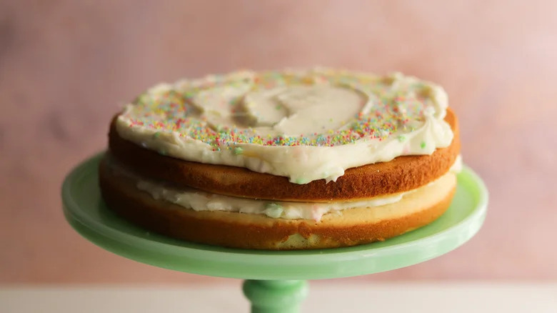 This recipe makes an almond-flavored cake with the addition of almond extract, but that can easily be swapped out for vanilla extract if you're not in the mood for a nutty flavor infusion. The frosting is also almond-flavored, but, again, feel free to switch that up to vanilla. Or, you can mix and match — pair up a vanilla cake with almond frosting or vice versa.