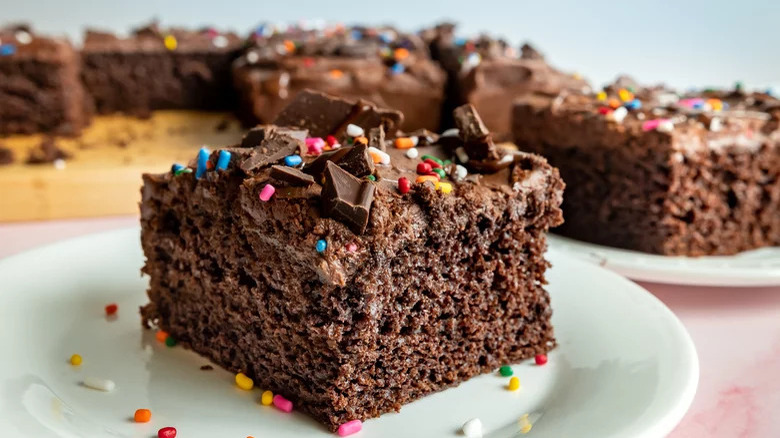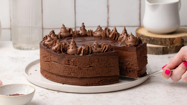 What happens when you combine chocolate and coffee in a dessert? You get a scrumptious and decadent chocolate mocha cake. This flavor marriage consists of a classic chocolate cake that has been infused with brewed coffee, all of which is topped off with a frosting that blends espresso powder and cocoa powder (along with a few other ingredients) for the perfect sweet mocha flavor. When the cake is assembled and finished, recipe developer Jessica Morone encourages bakers to get creative with decoration — so add any sprinkles, extra chocolate pieces, or even a drizzle of chocolate ganache.