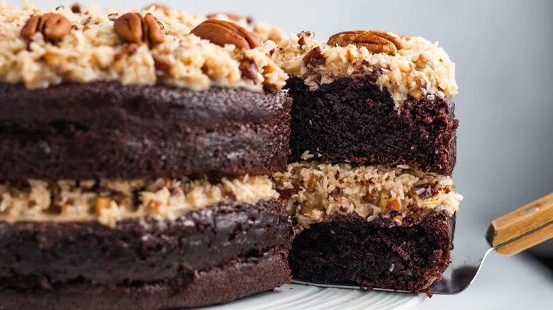 A good helping of cocoa powder goes directly into the batter, ensuring the prominence of chocolatey flavor, then the pecans and coconut are infused into the frosting. Finally, more pecans are added to the top for decoration to bring the cake together. Serve with ice cream or fresh berries.