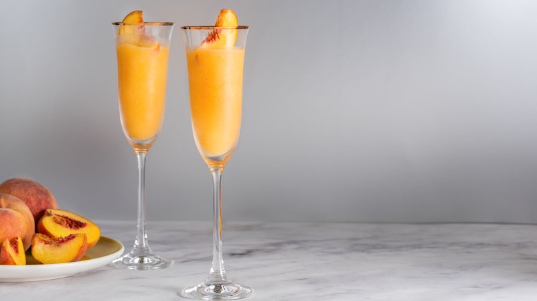 Now, just because these bellinis are peach flavored doesn't mean you can't experiment with other fruity flavors. Go ahead and blend up some frozen strawberries, raspberries, or mangoes and add them to your cup instead. Or if you're looking for something more like the boozy slushies that are so hot in the summer, add the bottled bellini into a blender with frozen fruit and some ice like you would for frosé. At 8% ABV, it's sure to make the perfect boozy substitute for rosé; just remember to adjust the sugar accordingly. But things don't have to be that fancy. You can easily pour these bellinis into champagne flutes and chill them with whole pieces of frozen fruit — be it peaches, strawberries, or raspberries — and top them off with an extra splash of prosecco at brunch.