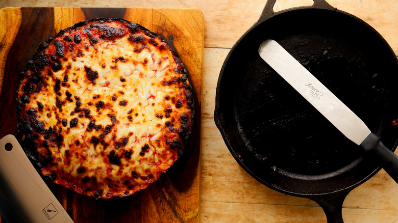 Thin-crust pizzas have their appeal, but there's something about a thick, crispy pan pizza with cheesy burnt edges that just satisfies in a different way. For one, this type of pizza doesn't have to be rolled or stretched. Typically made using a focaccia-like dough, this tender fluffy pizza crust starts with a no-knead dough recipe that proofs overnight in the refrigerator. After letting it sit in a well-oiled cast iron pan while it comes to room temperature, it will become light, airy, and ready to top.