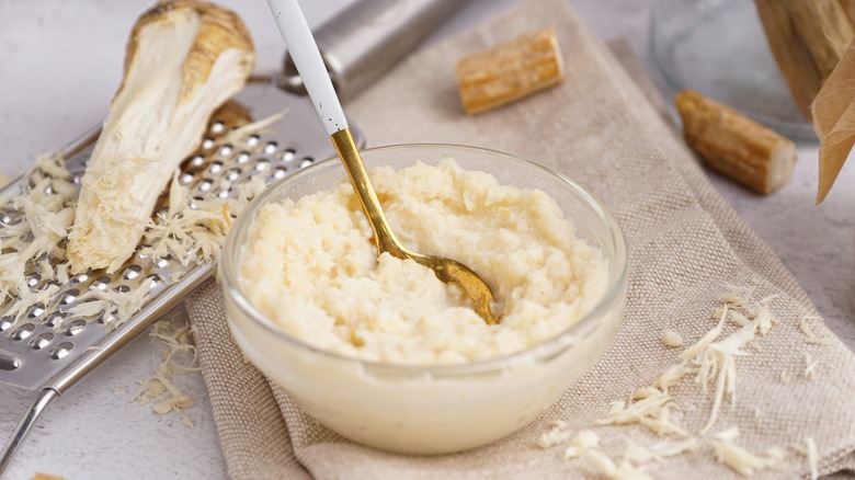 Hailing from the French town of Dijon located in Burgundy, the mustard is bold and tangy, and factors into dishes like deviled eggs, salads, potatoes, and chicken recipes. It is also a popular component of charcuterie boards as a dipping sauce for cheese and crackers. Many of the dishes that call for Dijon could use what horseradish brings to the table; it's earthy, spicy, peppery, and savory. The root vegetable is most commonly found grated or shredded in a jar with some kind of vinegar solution. Many swaps can be made for mustard, but horseradish is one of the most powerful. With that in mind, it's important that you do not make a 1:1 swap of the two ingredients. As it's spicier and more pungent, you'll want to add only half the amount of horseradish in a given dish.