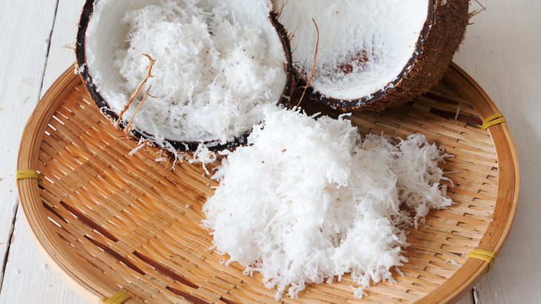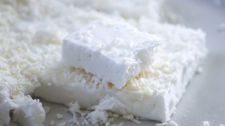 Don't worry — putting together homemade marshmallows remains largely the same with this addition. Starting from scratch with shredded coconut, first toast it in the oven, stirring occasionally until the edges are golden brown. Once the flakes are cool and dried, spread some of them onto the baking pan used to make the marshmallows. Toward the end of the process, after the confection has firmed, sprinkle more shredded coconut onto the surface. Finally, after you've cut the marshmallows into squares, dredge them in the remaining coconut for a complete coating.