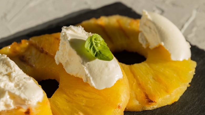 Similar to tossing sliced kiwi into your air fryer for a sweet and crunchy snack, a can of pineapple rings makes for a summer-inflected treat, and you could even mix up a batch of air fried tropical fruits to snack on. Focusing on pineapple, though, there are a few fun ways to prep your fruit so it's packed with even more flavor. If you're into spicy seasonings, try tossing your pineapple with some Tajín, cayenne pepper, or a dash of cinnamon. Use a brown sugar coating or a maple syrup glaze on your pineapple before frying if you want to keep things extra sweet.