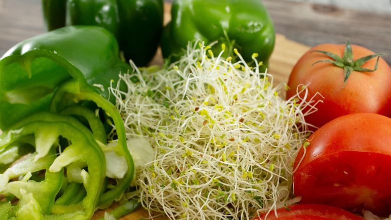 One option is to add a refreshing twist by using alfalfa sprouts in your BLT. They're earthy and flavorful and will help ground your sandwich with more vegetable-forward flavors. Grace Vallo recommends going with fresh arugula instead. But it's important to note that this flavor may be a little sharper than what you're looking for in this sandwich, so be sure to add it with care. If you're looking for something a bit more even-keeled in the flavor department, try Gocha Hawkins' suggestion and layer mixed greens into your sandwich instead of plain romaine.