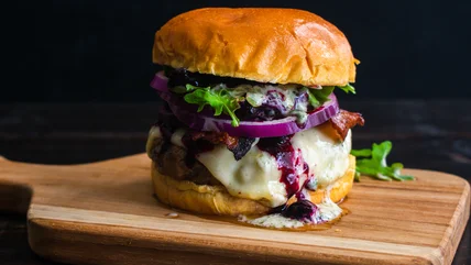 Havarti is mild enough to pair with most burger toppings, but aiming for those that complement its flavor and add contrasting textures or tastes is a great way to figure out your favorites. Unique toppings for gourmet burgers include sauteed mushrooms, bacon jam, or aioli — all of which are perfect for havarti. A fried egg on top would be an excellent match, too. The sweetness of caramelized onions pair well with havarti's creamy profile, and dill pickles add a classic tang that works well with the cheese. For an extra touch of fanciness, add roasted red peppers, a hint of truffle oil, or fresh herbs like basil or chives for added complexity or texture.