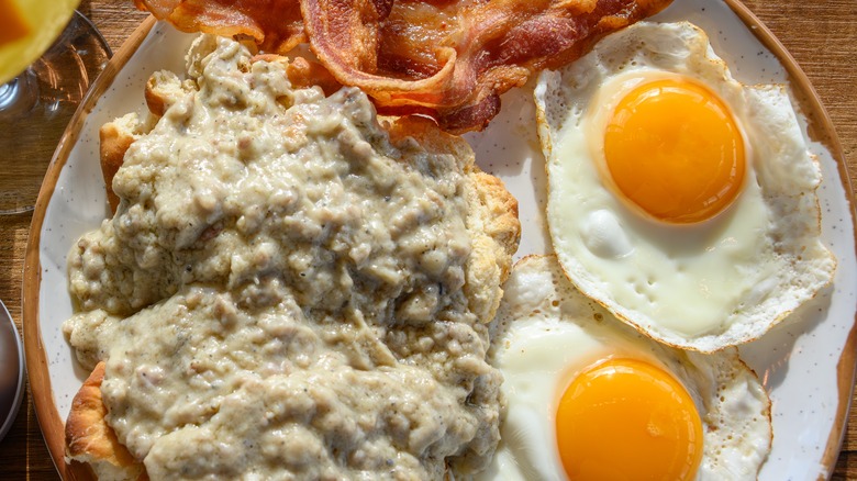 Though both of these gravies are tasty enough to enjoy any time of day, you're much more likely to see sawmill gravy over biscuits for breakfast. Cornmeal gravy, on the other hand, is usually served for dinner over main dishes that you might see in today's diners, such as chicken-fried steak or fried pork chops. It's not entirely clear how sawmill gravy became a Southern and Appalachian breakfast staple, but the American tendency to enjoy sausage for breakfast may have something to do with it.