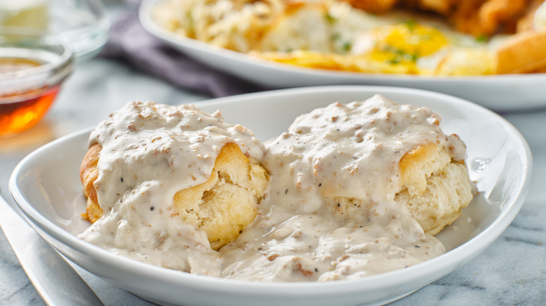 Soft, fluffy Southern biscuits — a far cry from their hard, dry cousins of yesteryear — also often make an appearance at breakfast with butter and honey. From there, it's not too far a leap to smother your biscuits in sawmill gravy as a savory treat rather than a sweet one. Meanwhile, since cornmeal gravy is often paired with beef or pork, it's more associated with dinner. Though it's not unheard of to eat steak or other rich meats for breakfast, these are usually reserved for later in the day.
