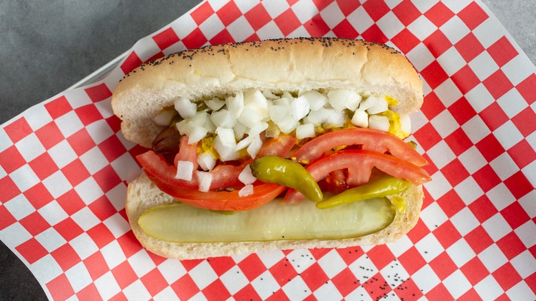 Luckily, burgers and hot dogs share many of the same toppings, so it shouldn't be too overwhelming to think about how you might top your burger dog with hot dog-inspired spreads. You could, for example, try to make a riff on the classic Chicago-style hot dog with toppings like chopped white onion, sport peppers, relish, and mustard. The acidity and pop from these toppings will complement the denseness of your burger patty ... erm, dog. You could also reign in some sweet undertones with caramelized onions or a succulent barbecue sauce.