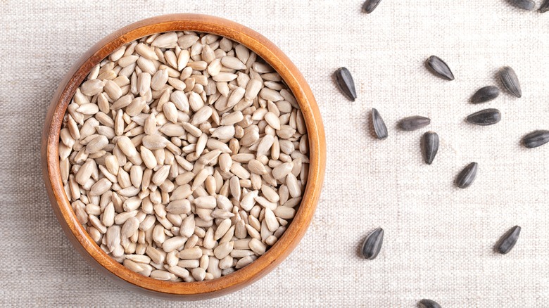 Although sunflower seeds have a slightly less sweet flavor than pine nuts, they still offer that lightly nutty taste and a somewhat soft texture. So while they may be the budget version of pine nuts when it comes to pesto, they can make a sauce that is just as tasty. If you heat them just a little, they'll release some of their oil and develop an even deeper flavor, although you can also incorporate them raw. Plus, these seeds come with plenty of nutritional benefits in addition to their deliciousness. They're packed full of vitamins E, B1, and B6, and may help increase energy levels, bolster your immune system, and improve heart health. There is one caveat to keep in mind, however: This new ingredient may give your final product more of a grayish hue.