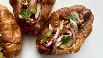 Level up your hot dog with some sophisticated French touches by adding cornichons, whole grain mustard, and marinated onions, and serving it on a croissant.
