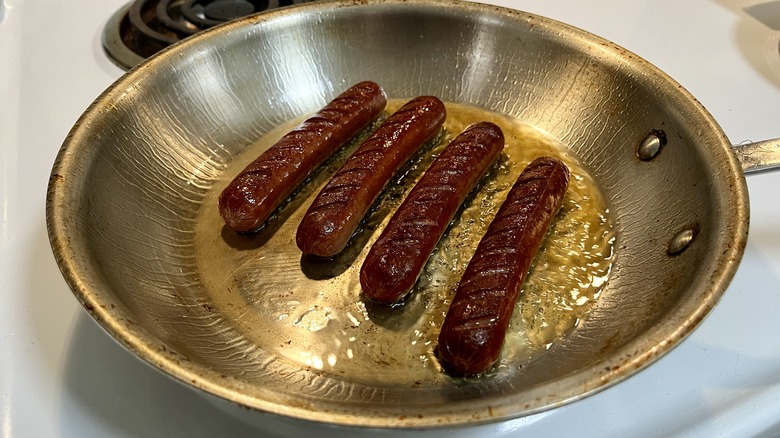 - Add the hot dogs, scored-side down, and cook, turning regularly, until browned on both sides.