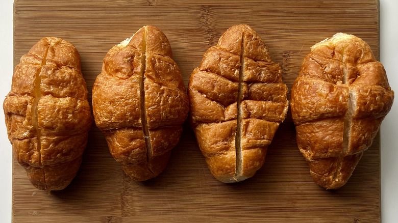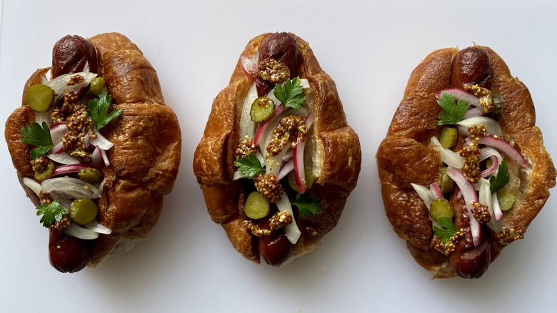 There's no denying that some croissants are better than others, and when you think of the better ones, there's a good chance that big, flaky, bakery-bought croissants come to mind. While those types of croissants are delicious on their own, as it turns out, they might not be the best vessels for hot dogs. "Don't splurge on the high-quality bakery croissants here," Le Moing advises. "They're flakier, crispier, and much larger which I found wasn't ideal as a substitute hot dog bun."