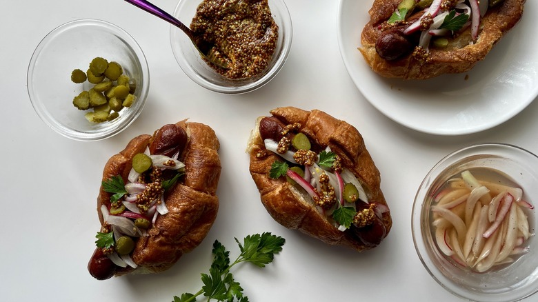 So, what kind of croissants should you use? Well, your wallet will be grateful, because the best type of croissant to use in this hot dog recipe is the kind you can find at just about any grocery store. Le Moing advises to look for ones on the smaller side, about 7 inches long or hot dog length, roughly. She also notes that the croissants need to be the straight kind, not the crescent ones, pretty as they may be, as it would be pretty challenging to evenly slice a crescent-shaped croissant down the middle and stick a straight hot dog into it. Regardless of exactly what type of croissant you do end up with, however, be sure to give them a healthy toasting before piling on the goodies, or else you'll be left with a sad, soggy croissant.