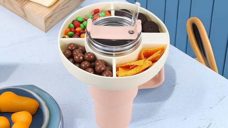Sometimes, an ice-cold drink makes you hungry for a snack to go with it. And that's exactly why the Stanley cup snack ring was invented. These plastic or silicone contraptions plunk down right around the top of your tumbler so you can guzzle and graze all at the same time. Each one is either circular, square, or pumpkin-shaped with scalloped edges and typically comes with four or five separate compartments — a dream for those of us with an aversion to our foods touching one another.