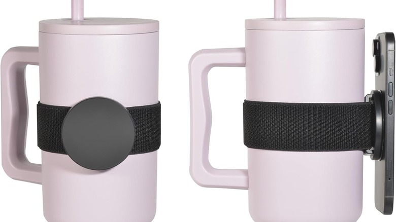 Of course, there's also an accessory for that. Straps exist that fit tightly around the body of a Stanley Cup and include a circular magnetic piece that holds onto your phone for you. There are also various phone attachments that can clasp onto your bottle's handle. But, no matter which method you choose, you can rest easy knowing your Stanley will be there for you as you set a new PR at the gym, while you film a makeup tutorial at your desk, or while you record the latest TikTok dance craze in your living room.