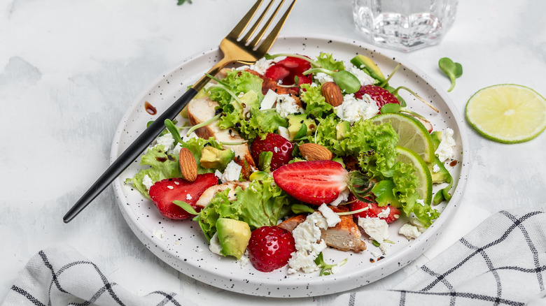 In terms of what to add strawberry vinaigrette to, just think back to its flavors. The bright, acidic sweetness makes deeper, earthier greens like spinach sing, and tempers the buttery richness of soft cheeses like goat cheese — even better, drizzle it over fried goat cheese salad with fresh peaches and tomatoes. That acid would also partner well with the funkiness of feta. Again, looking at complementary notes of herbaceousness, earthiness, and nuttiness, strawberry vinaigrette would make a veggie and herb grain salad pop. The dressing's light, refreshing quality also matches right up with a mandarin and rainbow radish salad, as vibrant in color as it is in flavor. And savory's not the only way to go, either, of course. Adding a bit of vinaigrette to a fresh, classic fruit salad marries its varying flavors and amplifies the overall taste with a zing.