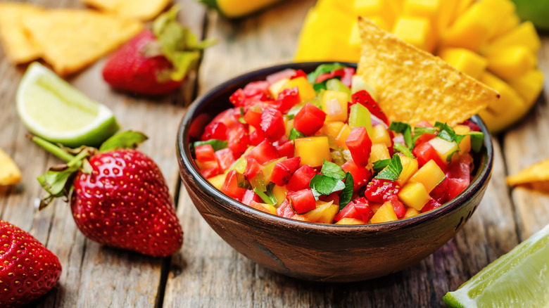 Instead of the bright acidity of tomatoes, use these chopped fruits for bursts of succulent sweetness. They may sound like completely different ingredients, but they have their similarities: Both are fresh, juicy, and, technically, fruits. However, incorporating strawberries doesn't mean you're morphing your salsa into a dessert. Instead, turn to spicy accompaniments to create a mouthwatering swicy (sweet and spicy) condiment that can keep up with the rest of the foods in this recent trend. Then, round out your recipe with classic savory ingredients that you'd find in pico de gallo or another-tomato based salsa. You can still dip your tortilla chips in it or dollop it on your burrito bowls, although there are plenty of other ways you can use this flavor-packed salsa, too.