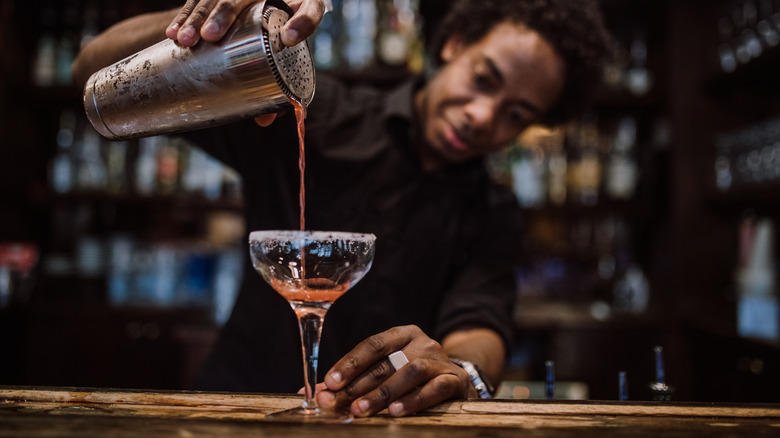 When you watch an experienced bartender make and pour cocktails, they usually do it with the glass sitting on the bar. However, there's nothing wrong with adjusting or holding the glass if you need to when pouring — especially if you're still practicing with a Hawthorne strainer.
