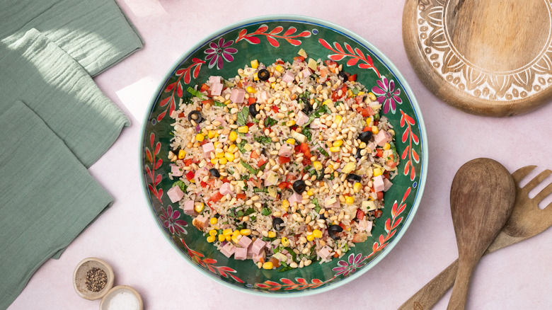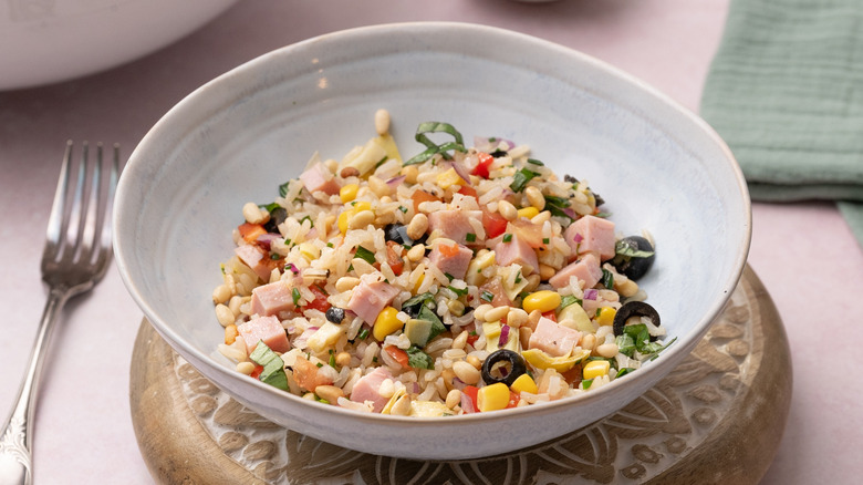 This fresh and crunchy Italian rice salad recipe is easily adaptable according to your personal preferences and what you have in stock. To make the recipe vegetarian but still full of hearty protein, the diced ham can be substituted for beans such as Borlotti or black beans. If you happen to have some cooked lentils around, toss those in, too.