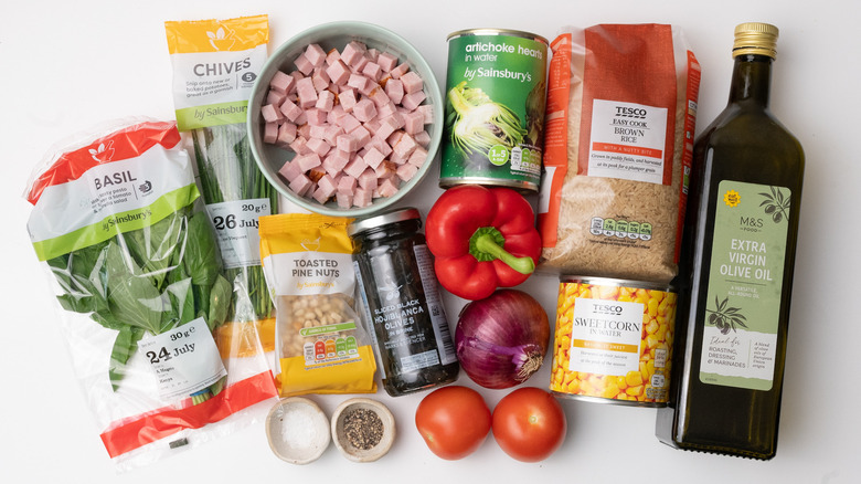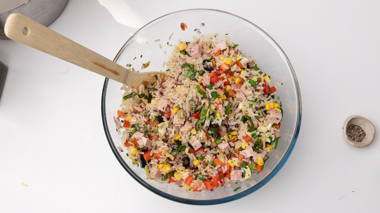 To begin this fresh and crunchy Italian rice salad recipe, first, you will need to gather the ingredients. You will want brown rice, ham, a red bell pepper, red onion, diced tomatoes, artichoke hearts, corn, and sliced olives. To give the rice salad lots of flavor, you will additionally need fresh basil, fresh chives, olive oil, salt and pepper, and toasted pine nuts, to finish.